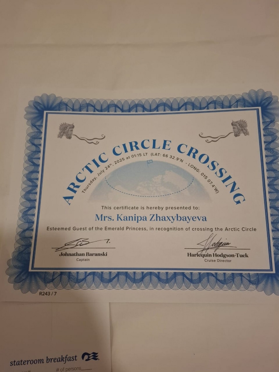 Отплыли из Саутгемптоне на окаеанском круизном лайнере EMERALD PRINCESS* (Изумрудная принцесса), имеющий на борту, более 2500 туристов, 1200 обслуживающего персонала. Проплыли по Северному, Норвежскому, Гренландскому, Ирландским морями, Атлантическим океаном. Сказочные фьорды, выплывающие из тумана местности с небольшими городами со сказочными домиками и природой,  в июле месяце цветут одуванчики, такой же, как у нас клевер, ноготки и т.д. 24.07.2025 года, ночью, мне в каюту принесли и вручили сертификат, за пересечение Северного Полярного круга, было приятно. И так, путешествие было не только интересным и приятным, благодаря моему турагенту Ирине Кулешовой, было комфортным, перелет из Алматы в Лондон и обратно, трансферы, размещения в отелях, организованные экскурсии с гидами на местах, все как всегда на высшем уровне, за что, не устаю ей приносить свою благодарность. Спасибо большое Ирина, желаю вам здоровье, счастье, достижении в вашей работе, процветание вашей фирме и благодарных клиентов! Я закрыла, очередной свой гештальт