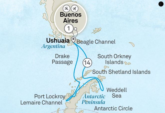 Описание данного маршрута является общим планом экспедиции. Маршрут может меняться под воздействием внешних факторов: погоды, ледовой обстановки и т.д. Вертолетная экскурсия на остров Сноу-Хилл зависит от погодных, ледовых и иных условий и может быть отменена в целях обеспечения безопасности.