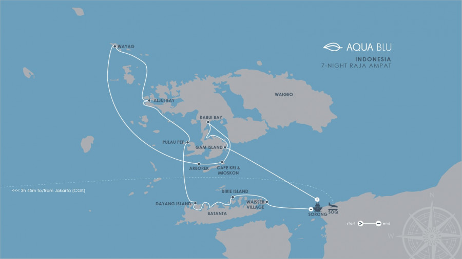Маршрут: Соронг, Индонезия - Остров Тысячи Храмов и остров Йиллет, Индонезия - Рифы Дарам, Индонезия - Сабуда, Индонезия - Пролив Нептуна и Фибиасет, Индонезия - Капаткол и мангровые заросли Blue Water, Индонезия - Острова Бу и Кофиу, Индонезия - Соронг, Индонезия
